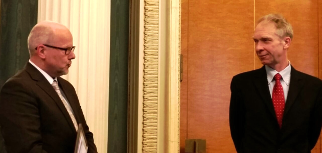 Gesandter Oleg Krasnitskiy (rechts) empfing das Kernseminar in der Botschaft Russlands.