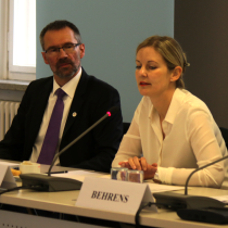 Der zweite Teil der Veranstaltung nahm die Zusammenarbeit deutscher Ministerien und Sicherheitsbehörden im Ausland in den Blick. Christiane Amari, die als Verbindungsbeamtin des Bundesministeriums für wirtschaftliche Zusammenarbeit und Entwicklung beim Bundesministerium der Verteidigung tätig ist, öffnete den Blick auf die derzeitigen zivilen und militärischen Dimensionen deutscher Sicherheitspolitik, wie etwa in Mali. Einen weiteren inhaltlichen Schwerpunkt bildete daran anknüpfend die Ertüchtigungsinitiative der Bundesregierung, welche regionale Partnerakteure durch Ausbildungs- und materielle Unterstützung in die Lage zu versetzen soll, selbst für Sicherheit und Stabilität in ihrem eigenen Land und gegebenenfalls auch mit einem entsprechenden Mandat in ihrer Region zu sorgen.