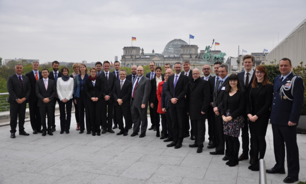 Eine Gruppe von Menschen steht auf dem Dach der US-Botschaft in Berlin; im Hintergrund ist der Deutsche Bundestag sowie davor die Quadriga auf dem Brandenburger Tor sichtbar.