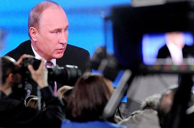 Fernseh- und Fotojournalisten auf einer Pressekonferenz des russischen Präsidenten Wladimir Putin; Putin im Hintergrund auf einer Großbildleinwand